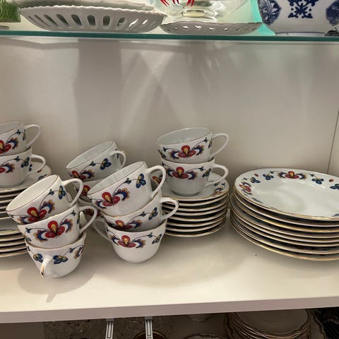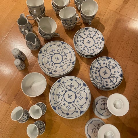 Pent brukt servise selges. Hvitt med blå kant. 32 deler. Bortsett fra et kantavslag på en middagstallerken er det ingen skader. Perfekt for den som skal flytte på hybel eller lignende.