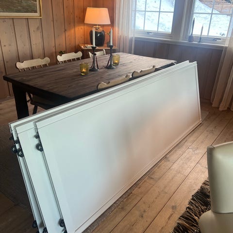 Ubrukte skyvedører med skinner fra Garderobemannen selges for 1700kr. Hvite dører med sølvramme. Kan sendes mot at frakt og emballasjekostnader dekkes av kjøper