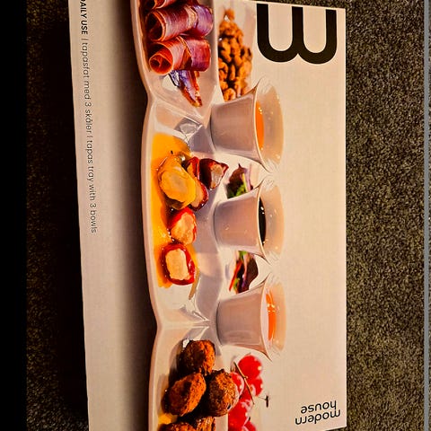 Helt ny tapas grillsett 6 dele hvit med dansk disign - 4 firkantede tallerkener med ruminddeling 26x26cm. Rektangulære bakker 21x10cm. Selges billig!