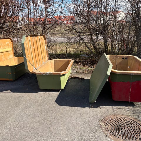 Kassene er norskproduserte, rotasjonsstøpt (tåler alt) og laget i kulde- og UV- bestandig materiale PE (polyetylen). Kan løftes med truck.