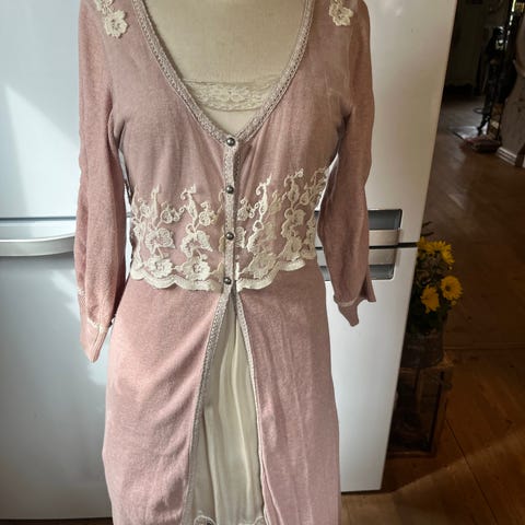 Søt liten vest med mange søte små detalger fra Culture. Dekorert med små emaljer og broderier, dusker og silkefor. I tillegg er deler av ryggen "delt i 2. Fremstår som ny.