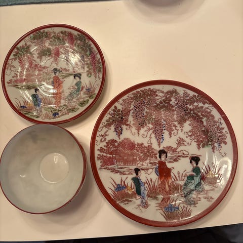 Gamle kinesiske kopper med skåler. Serviset er trolig kjøpt i Kina en gang i mellomkrigstiden. Selges samlet for 700 kr.