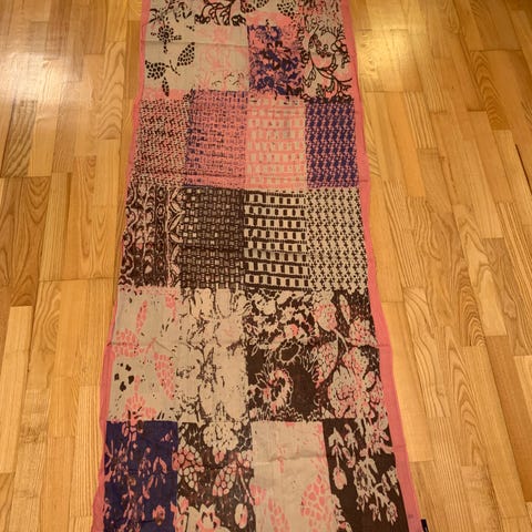Lekkert skjerf i 100% ull fra Mexx. Størrelse: 52 cm* 190cm. Lett mønstret i gråfarger og lilla. Brukt én gang. Ny pris: Kr 999, selges Kr 400