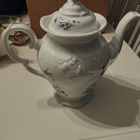 Vintage. blader. blomster. grå blomster. gyldne blomster. kanne. relief. stavhank.tekanne. Porsgrunn Porselænsfabriktekanne. Kaffekanne. Antikk.