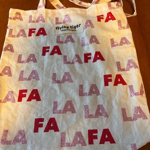 Skulderbag av stoff, kr 100 pr stk. Ca 28 cm x 34 cm