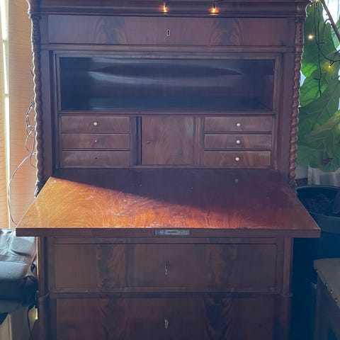 En liten skuff inne i skapet mangler. Ellers fire store, gode skuffer som rommer mye og fem små inne i skapet.