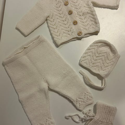 Håndstrikket offwhite ulljakke i et tettstrikket mønster noe som gjør at jakken holder godt på fasongen. Kun brukt en gang! Passer fra ca 2-6 mnd.