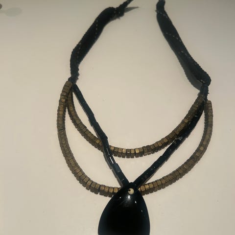 Halssmykke i tekstil i blått og sort av Heidi Mortensen, kunstner tilknyttet Det Gule Huset i Asker.