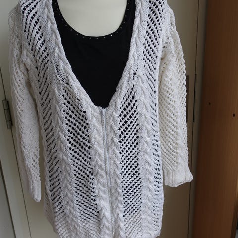 Hjemstrikket jakke (tykk og god ) med hette , belte. og 2 lommer foran. Ny.