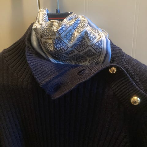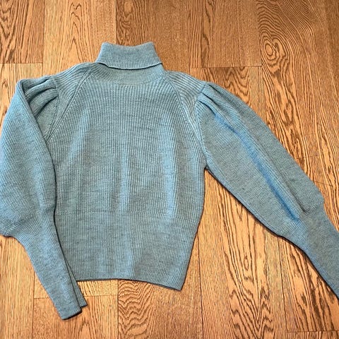 Blå, finstrikket, ballongermer, høy hals