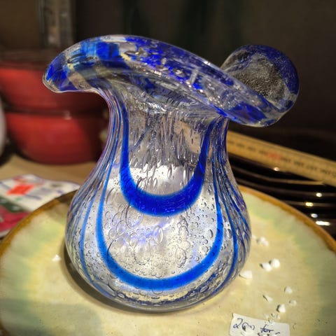 VINTAGE/RETRO "GAMMLE " NYDELIG GLASS SKÅL "I BLÅTT/GULT OG BLANKT GLASS "