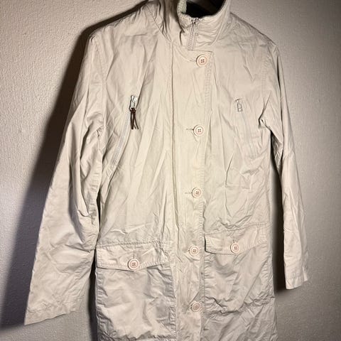 Ny DANWEAR offwhite ytterjakke med fine detaljer. God og varm, med flere lommer, glidelås og knapper, også kort belte fra hver side som kan strammes .