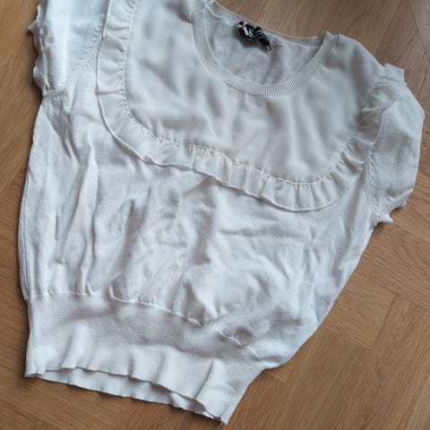 Nydelig "maritim" topp, fine detaljer. Split I sidene, glidelås på skulderen.