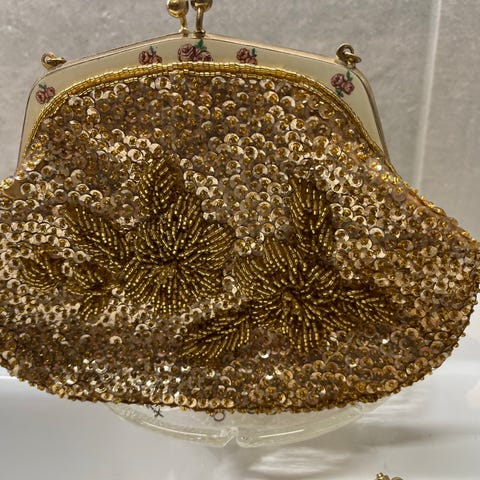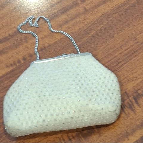 Hvit selskap veske, med perler og sølv paljetter. En del brukt men hel.
