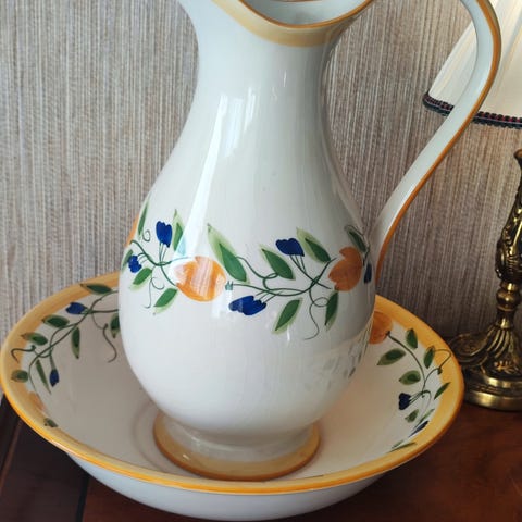 Eldre sett bestående av: vaskefat, potte, kanne og to såpeskåler. Pent sett med grønne blader og blå blomster. Et lite skår ved hank på kanne, og liten sprekk i glasur på potte. Se bilder.