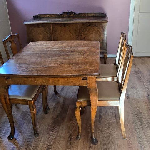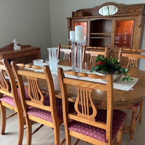Flott spisestue med bord, 8 stoler, hjørneskap, skjenk og skap
