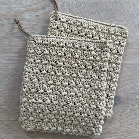 Hjemmeheklede grytekluter i bomullsgarn, store og veldig gode i bruk. Sandnes garn, Mandarin classic, mercerisert og kan vaskes på 60 grader. Heklet i vaffelmønster. Kan sende, porto kommer i tillegg. Se gjerne mine andre annonser.