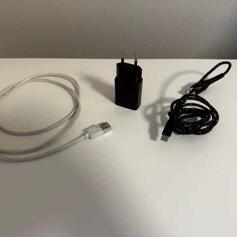 HTC lader til batteri / mobillader / batterilader med ladekabel, ørepropper / headset, deksel, penn og kabler selges.