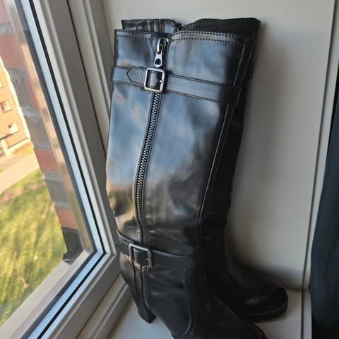 Må dessverre selge disse fine sorte støvlene fordi de er for små til meg! Veldig god, kraftig såle, lekker sølvfarget innside i mykt skinn, metallspenne øverst og glidelås på innsiden. Høyde fra gulvet 40cm.Kun brukt to ganger!!