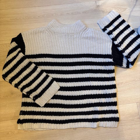 En blå og hvit strået genser