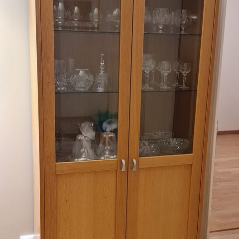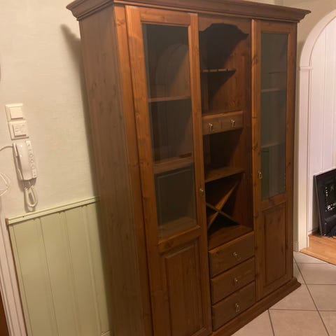 Skapet har god oppbevaringsplass, og er to-delt i valnøt farge.Meget pent brukt.Den øverste delen har glass i frontene, slik at gjenstandene i skapet blir godt synlig. Innveding er det flere hyller som gir god oppbevaringsplass til glass og servise. Passer både på kjøkken og stue.Skapet har to dører og 4 skuffer med håndtak, passer godt inn i de fleste hjem.