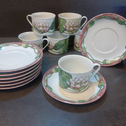 9 kaffekopper (en med en påbegynnende sprekk, uten logo, men asjettene har)