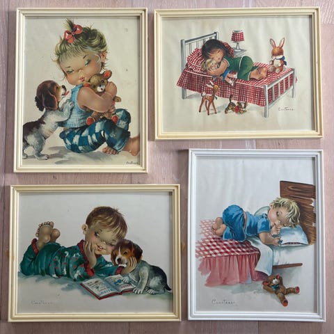 Vakre gamle bilder med barn/ julemotiv. Gamle amerikanske bilder med sjarmerende barnemotiver, begynnelsen av forrige århundre. Innrammet, en spesiell julegave til barnerommet.