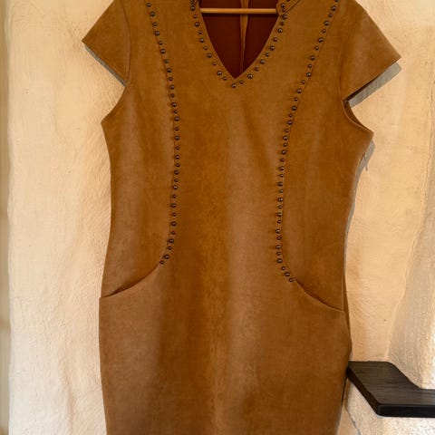 Kort kjole i falsk suede-stoff med mye stretch. Blondedekor over brystet.