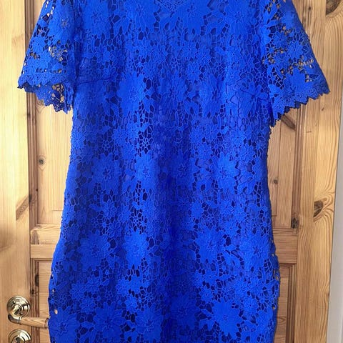 Nydelig lyseblå BRODERT kjole. Knapper. Tøybelte.