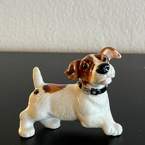 Dalmatiner med valper, merket Japan under. Den ene valpen mangler halen, og den voksne har reparert fot. Høyde 10 cm, bredde 9 cm. Høyde 5 cm, bredde 5 cm.