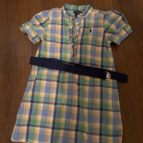 En helt nydelig kort ermet kjole fra Ralph Lauren ned snøring i livet og herlig mønster 👌. Knapper nedover hele og hvit krage. Kjolen har hvit bomulls for. Den er i str 6 (ca 110-116). Den er knapt nok brukt og klar for nye prinsesse💘