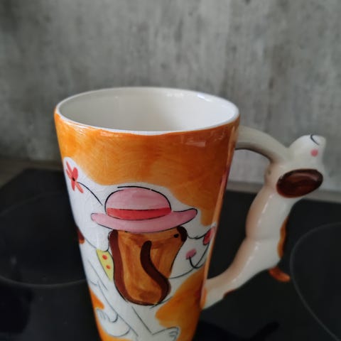 4 kopper med dyr med hale som håndtak selges. Størrelsene er ca 1,5 til 2,5 dl. De har kun stått til pynt, og ikke blitt drukket av.