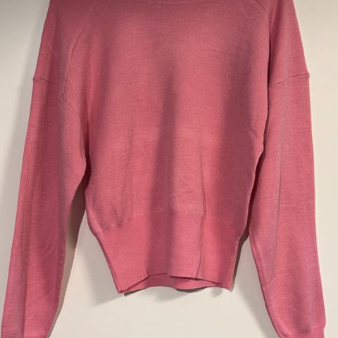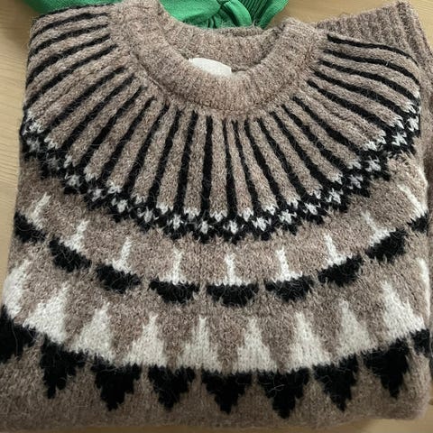 Akryl, ull og mohair blanding. Litt stor i størrelsen.