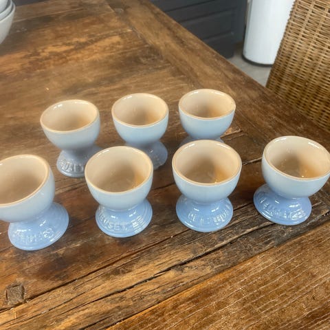 Eggeglass i blå og hvit keramikk. Settet består av seks eggeglass med et blomstermotiv. Eggeglassene er ideelle for servering av kokte egg og gir et dekorativt preg til frokostbordet. Selges samlet for 250 kr.