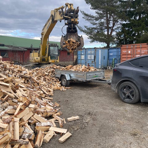 4 700,- for 4m3 løs nykløvd bjørkeved levert med tipphenger.