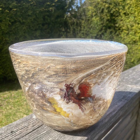 Stor flott glassbolle, underfang glass med røde og grønne stilisert blomster dekor.