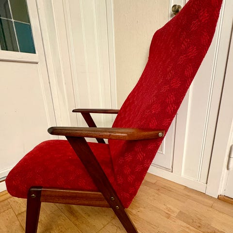 Lenestol i god stand. Litt slitasje på bånd foran på sete. Løs pute. Teak armlene. Merket Brøderna Anderssons industrier i Ekenässjøn. Høy kvalitet. Må hentes