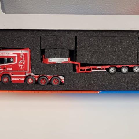 Scania R500 6X4 Topline Fra NZG Nooteboom. Med 2 Axle Pendel-X Euro Low-Loader Skala: 1:50 Kun tatt ut av esken for fotografering. Total lengde ved max uttrekk: 57cm. 40cm. uten forlengelse. Ligger med deler i poser. Aldri vært montert. Selges for høystbydende over 1850,- + frakt etter postens takster 5 min. regel. Auksjonen avsluttes15,01.2026 kl.20.00. Sender med Norges pakken m/sporing og forsikring Bud økning 100,- Ligger også ute på flere salgs sider!