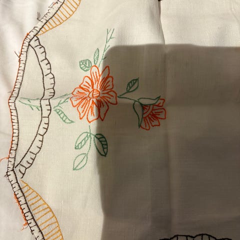 Hvit nylon med blomster kant i friske gule og grønne toner.