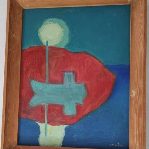 Maleriet som selges er olje på plate og er signert av kunstneren nede på midten.