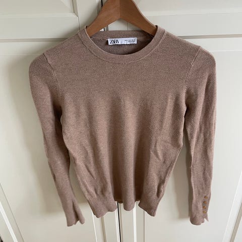 Nydelig kremfarget/lys beige Zara genser med flettemønster i størrelse S selges. Sammensetning: 50% bomull, 25% viskose, 20% nylon og 5% angora. Brukt et fåtall ganger. I veldig god stand.