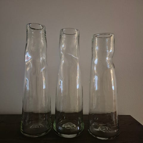 Gamle, håndblåste karafler, rundt 1900. 24,7 og 21,4 cm. I utmerket stand. 150,- pr stk.
