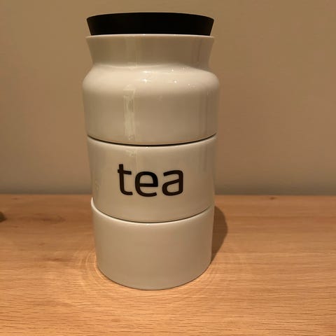 Hvitt tetårn med plass til oppbevaring av tre typer te. Dekorativ på kjøkkenbenken. Gir deg enkel tilgang til tre ulike te-typer.