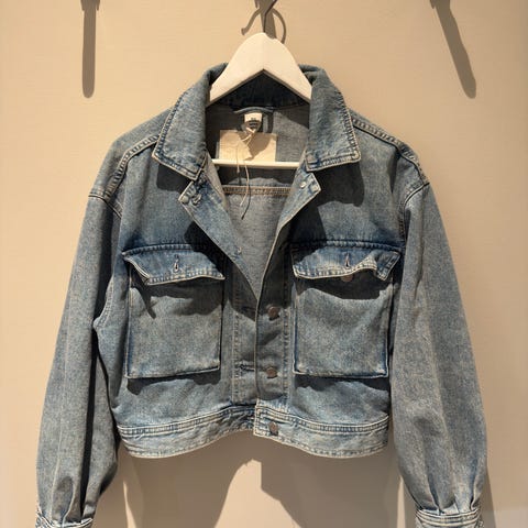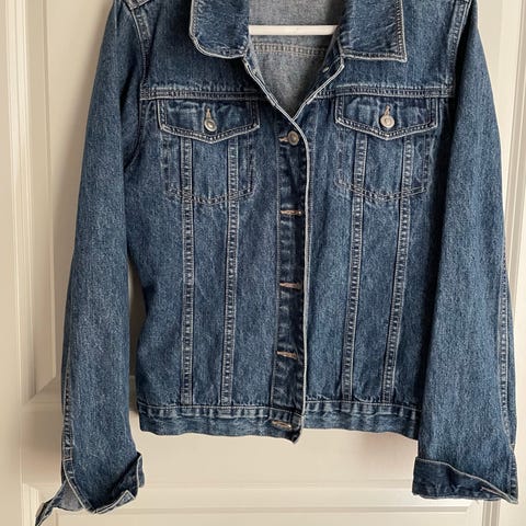 Denimjakke er stor i størrelsen. Jeg bruker normalt M. Pent og lite brukt.