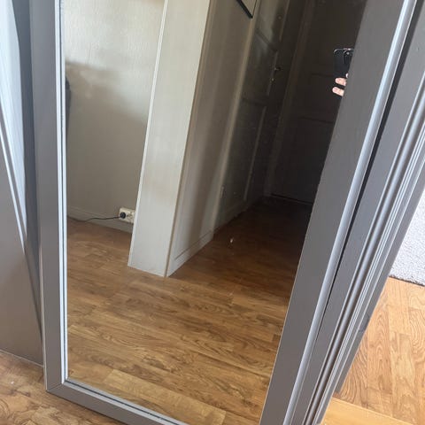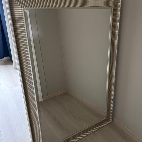 Grunnet mindre leilighet, selges veggspeil med sølvfarget treramme.