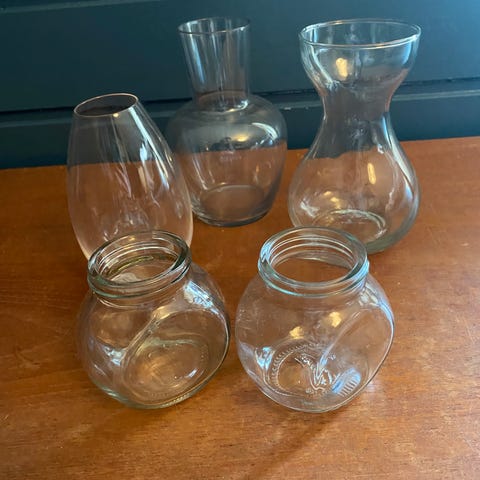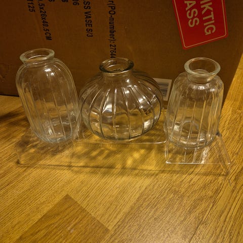 11 smale høye (ca 25 cm) blomstervaser. Kun brukt på tre konfirmasjoner. Flott til bordpynting.