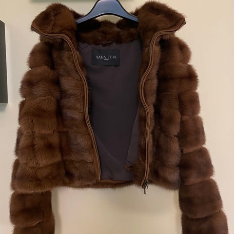 Brun dunjakke med ekte pels. Det var en litt brukt gave men veldig fin.