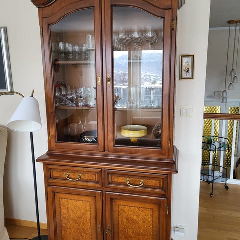 Skjenk med overdel med glassdører. Skjenken er laget for å få et gammelt preg, utførelse i et mørkt treverk. Skjenken har høyde 90 cm, og kan benyttes alene. Overdel har høyde 115 cm.