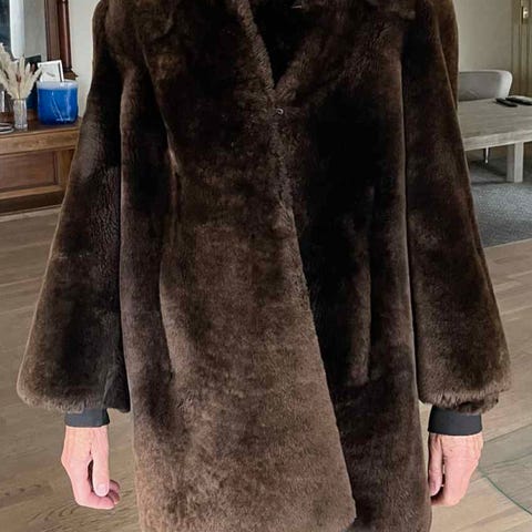 Jakken er helforet og brun mink på armene kan brettes ut om ønskelig.