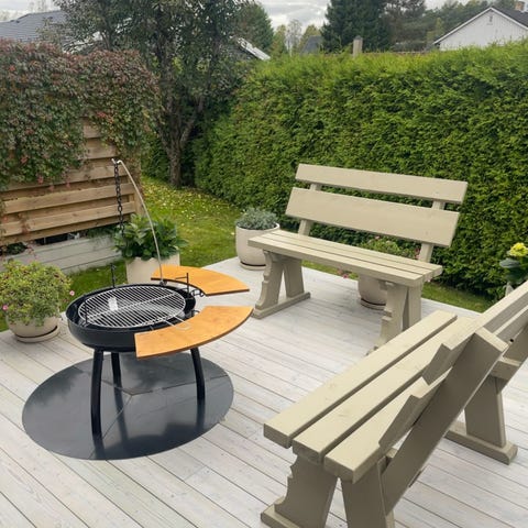 Hagebenk, hagemøbler, benk, sittebenk, utebord, hytte, hyttemøbler, hyttemøbel, utebenk, bålpanne, bålpannebenk, utemøbler